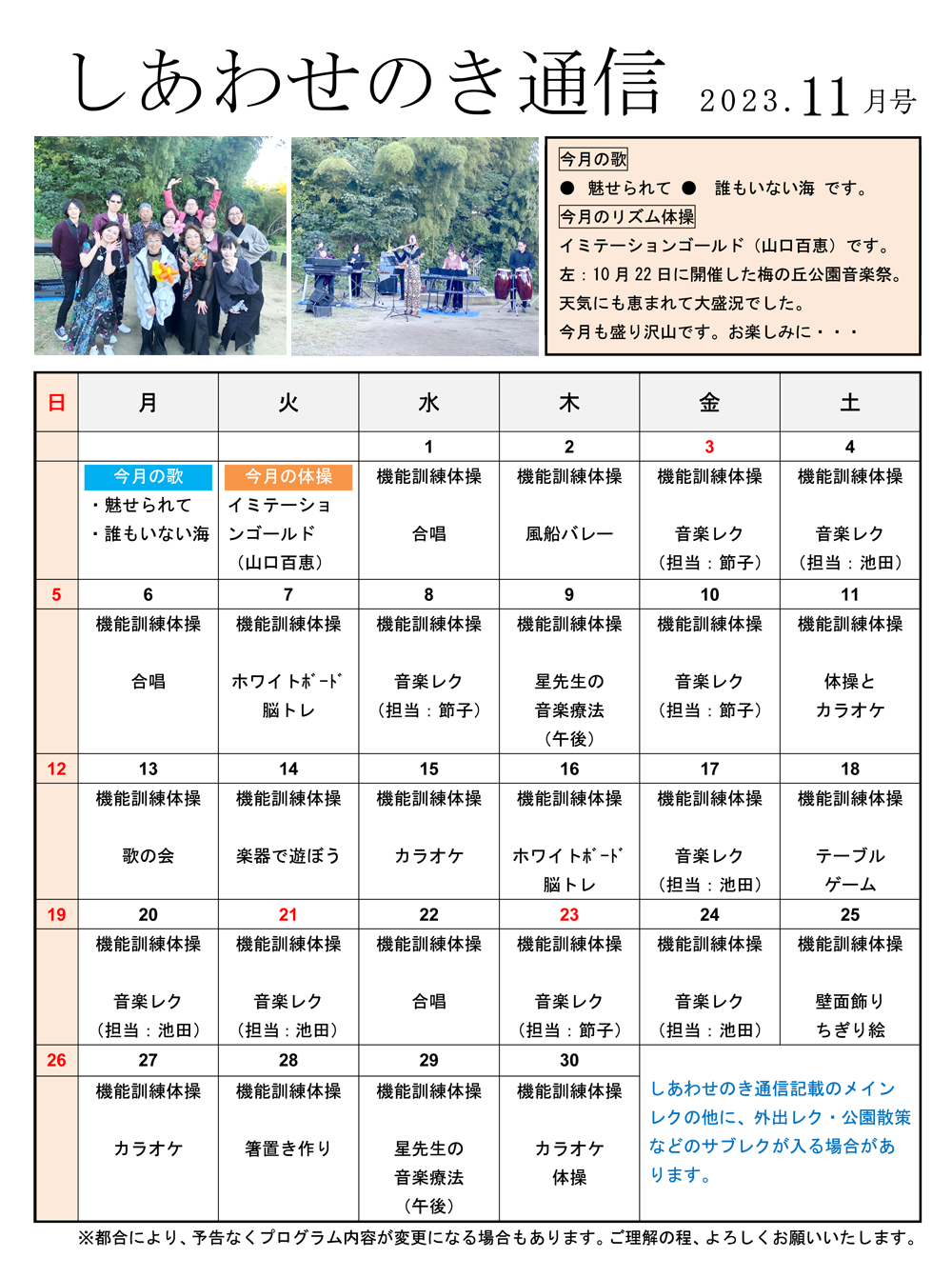 11月 「しあわせのき」音楽イベント開催のご案内